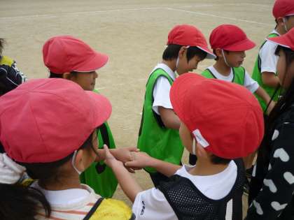 ゲームに勝っても負けても,最後は気持ちのよい挨拶を・・・。買って嬉しい気もち・・・負けて悔しい気持ち・・・。色々ですが,最後はきちんと整列し,「がんばったね。」「ありがとう。」の握手を♪この後,みんなで振り返りをした時には,リーダーとしてチームをまとめてくれたお友達,作戦タイムでいいアドバイスをしてくれたお友達,ボールに果敢に立ち向かい,ナイスカットを連発したお友達など・・・一人ひとりのがんばりに拍手が湧きました♪