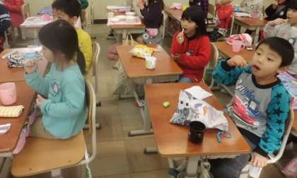 8日は歯みがきハッピーデーでした。給食を食べた後に,音楽に合わせて歯みがきをします。音楽がリズムが良くて楽しい曲なので,喜んで歯みがきをしています。歯みがきが上手になって,虫歯のない歯にしたいです。