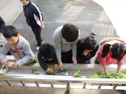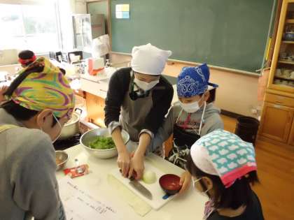 学校の畑で育てた,にんじんとレタスを収穫して,調理実習を行いました。野菜作りでは,種まきから,水やり,草ぬきなどの作業を行い,自然の素晴らしさと野菜を作ることの大変さを学びました。自分で苦労して得ることのできた収穫物を口にして,その喜びや達成感も味わうことができたと思います。にんじんはにんじんをたっぷり使ったカップケーキに,レタスはレタスと卵のスープを作りました。自分たちで育てた野菜で作った料理の味はおいしさも一入だったようです。