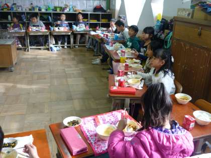 今日は,12月生まれのお友達のお祝いに『お誕生日給食会』をしました。お誕生日係さんが企画してくれ,楽しいひとときになりました。大すきなカレーに牛乳の乾杯♪みんなニコニコ笑顔でした!!