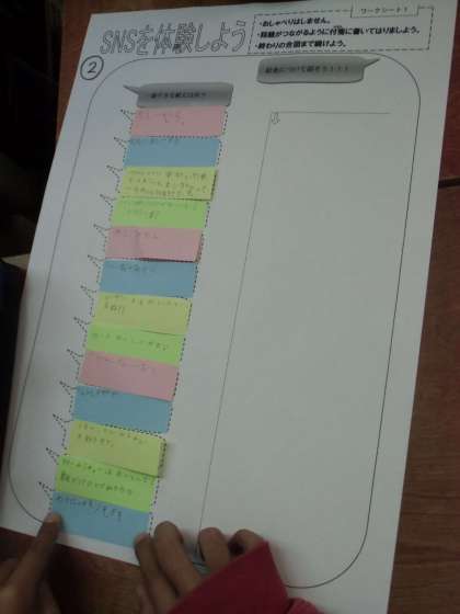 今日は携帯電話市民インストラクターの方にも来ていただき,スマートフォンとのつきあい方について学びました。SNSのメッセージアプリを付箋を使って実際に取り組み,映像を見ながら,問題点や改善方法をみんなで考えました。グループで話し合い,素晴らしい意見をどんどんだすことができました。ぜひご家庭で子どもたちの話をきいてあげてください。