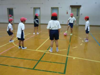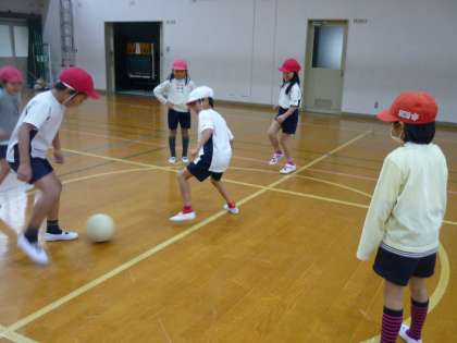 今週から,体育の時間に『ボールけりゲーム』の学習をしています。1時間目は,グループごとにボールを蹴ったり,止めたり,ドリブルしたりする練習をしました。次の時間からは,実際にコ—トを使って,攻め方や守り方の工夫をしながらゲームを進めていく予定です。
