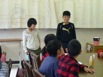 今日の『おいもパーティ』のはじめの挨拶も2年生が担当しました。みんなの前でしっかりと話すことができた2人に大きな拍手が湧きました♪