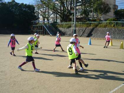 今日は,朝からみぞれ混じりだったので,運動場で『ボールけりゲーム』ができるか心配していましたが,日頃の行いからか体育の時間には,お日様がニッコリ♪パスゲームで習得したことも生かして,早速ゲームを楽しみました。