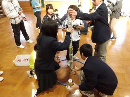 大原野中学校区にある大原野小学校,上里小学校,大原野中学校の育成学級のみんなで交流会を行いました。中学生のお兄さんお姉さんが計画して,空きかんボーリングや缶積みなどのゲームをしました。また,中学生が「いきものがかり」の「エール」を色々な楽器で演奏し,一緒に歌いました。中学生のとても上手な演奏に,子どもたちは憧れのまなざしを送っていました。あたたかい雰囲気で迎えられ,優しく教えてくれる中学生に小学生のみんなはとても嬉しそうで,楽しい会になりました。