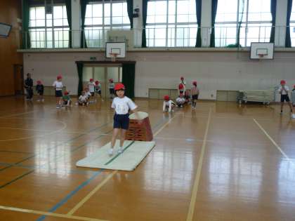 体育の時間に『とびばこあそび』の学習をしています。一人ひとりのめあてに合わせて,小さい跳び箱の場や高さの違う跳び箱の場などの練習の場を作って,開脚跳びの練習をしています。