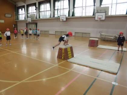 体育で跳び箱遊びをしました。低い段をふみこしたり,またいでこえたりした後に3段・4段に挑戦しました。みんな何度も何度も繰り返し練習していました。
