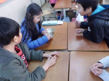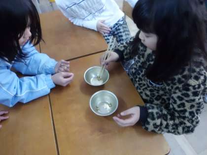 さあ,誰がおはしの持ち方がうまく,豆を早くつまんで運べるでしょうか?