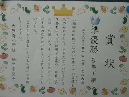 今日の中間休みに豆つまみ大会がありました。クラス全員で練習をして,メンバーだけでなく,「クラスみんなでがんばろう」を合言葉に大会にのぞみました。