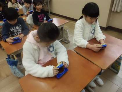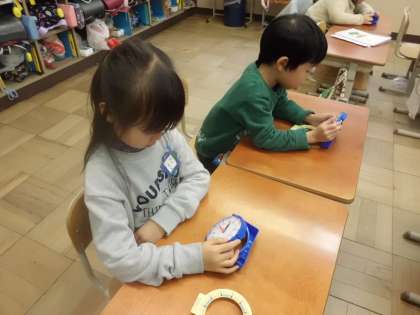 算数で時計の学習をしています。時計の模型を使って,1めもりが1分で60分あることを確かめました。その後に,「8時35分」「11時51分」など時刻を言うと,その時刻になるようにはりを合わせていました。