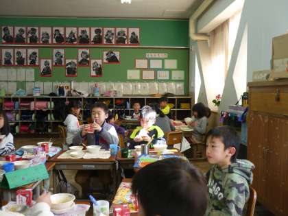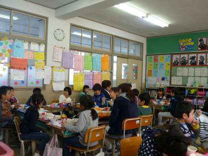 給食室の見学に引き続き,今日は『交流給食』もありました。たけのこ学級のお友達や担任の谷村先生,上田事務職員さんが来てくださいました。普段はゆっくりとお話する機会がないのですが,今日は一緒に給食を食べながらたくさんお話をすることができました。手作りの名前プレートも喜んでいただけて,子どもたちもニコニコでした♪