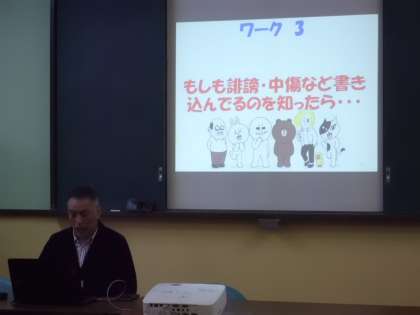 後半は,子どもが間違った使い方や,人を中傷するような書込みをしたという設定で,親役・子ども役・意見を言う役と3人に分かれ体験しました。