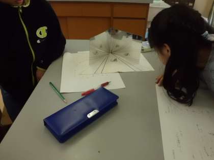 2月18日(土)理科室で土曜科学実験教室を行いました。鏡を使った実験をした後,「ビー玉万華鏡」を作りました。講師の丸橋先生は理科の学習について大変詳しく,毎回いろいろなことを教えてくださいます。今回も鏡を曲げたり,角度を変えて置いたりしたときの物の見え方について実験をしました。参加した人たちは,意外な見え方にびっくりしていました。最後に作った万華鏡はいろんな色の組み合わせがあり,世界に1つしかない自分だけの「ビー玉万華鏡」ができました。