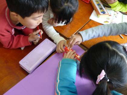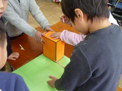 今日から『はこの形』の学習が始まりました。今日は,はこの面にはいろいろな形があることに注目して,はこの面を紙に写し取りました。その後,グループで話し合い,はこの面は長方形や正方形の形をしていて,全部で6つあることを確かめました。