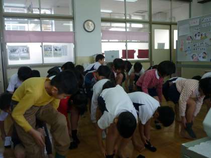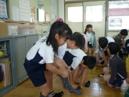 2年生での「くつしたぬぎはきチャレンジ」も今日が最後でした。いつもは,脱ぐ→履くなのですが,最後ということで今日は脱ぐ→履く→脱ぐ!にチャレンジしました。体のバランス感覚も高まっているようで,とってもスムーズにこなしていた2年生です。
