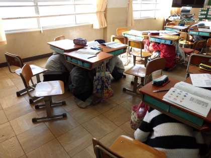 京都市一斉防災行動訓練(シェイクアウト訓練)に伴い,大原野小学校では9時31分に地震発生の際についての訓練をしました。緊急放送の後,教室にいる場合は机の下に,運動場や体育館にいる場合は真ん中に集まりました。教室では強い揺れに対し,机の下に頭を入れるだけでなく,机の脚もしっかり持ちました。何回も訓練することで,万が一に備えたいと思います。