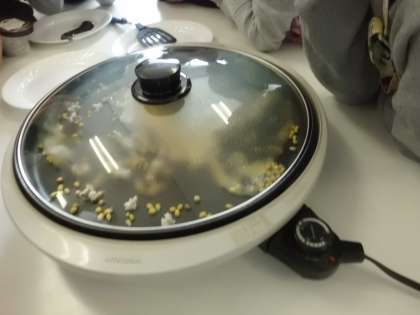 お楽しみ会として,自分たちで育て収穫したポップコーン