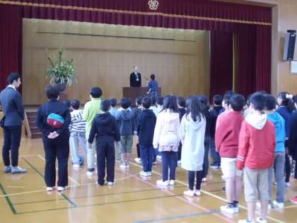 今日は1年生から5年生までの修了式です。5年生の代表の人が壇上で修了証を校長先生から手渡されました。校長先生からは今年の目標であった「自ら学ぶ」「人とつながる」について,自主勉強をしている人が増えていたり,キラキラ見つけで友達の良いところを見つけられる人が増えていたりしている,と言うお話がありました。その後春休みの過ごし方について気をつけることを話されました。