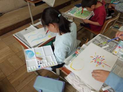 3年生になって初めての絵の具を使って絵を描きました。絵の具を混ぜたり,水の色を変えたりしていろいろな色を作りました。見つけた色や形であらわしかたを工夫していました。世界に1つだけのぼく・わたしの作品を作りましょう!