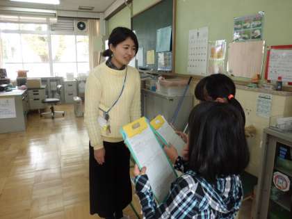 1年生と学校探検をするために,各教室の説明の看板を作ります。そのために,各教室の担当の先生のところに行って,インタビューをしました。どんなクラスなのか・何をする部屋なのか・何が置いてあるのかなどを聞きメモをとっていました。中間休みや昼休みにはりきってインタビューをしに行き,「聞いてきたよ。」と嬉しそうに帰ってきていました。