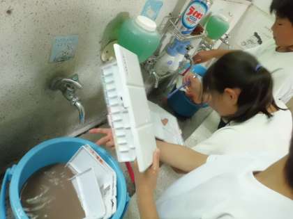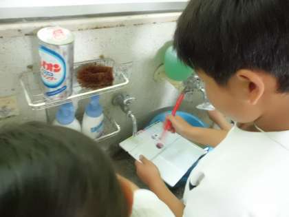 図工で使った絵の具のパレットを洗い流す時に,節水を心がけようということでバケツに水を張ってそれにしばらくつけておき,少ない水で洗い流しました。子どもたちも地球にやさしい3年生になれるようがんばってくれました。