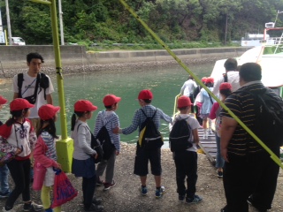 貸し切りバスで賢島に到着後は,船でみさきの家の「なかよし港」へ向かいます。