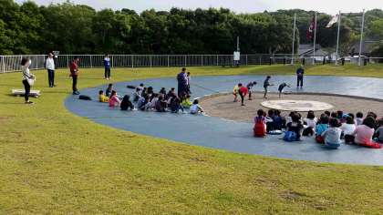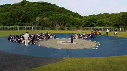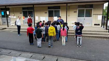 2日目の活動が始まっています。朝の集いでは,一緒に宿泊している学校同士で,学校紹介を行います。