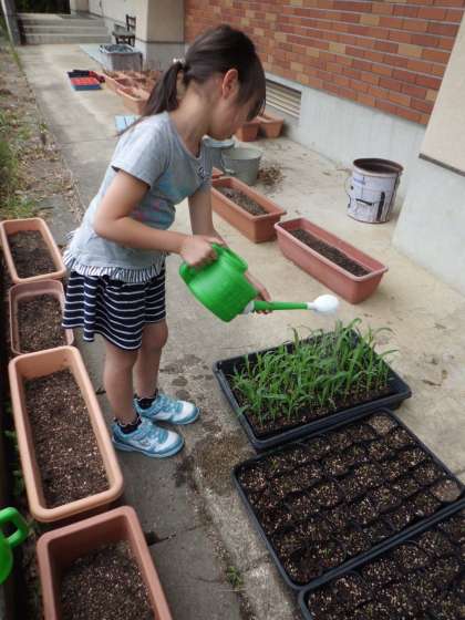 1週間で,さらに大きくなりました。大きくなってねと声をかけながら水やりをしています。18日の木曜日に,畑に植え替える予定です。どんどん育っていくのが楽しみです。