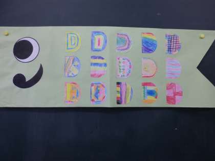 19日に1年生を迎える会があります。その時のかざりのこいのぼりを作りました。1年生に喜んでもらえるように,1人1人うろこの模様を工夫して色をぬりました。かわいいこいのぼりができあがりました。