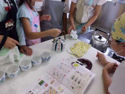 家庭科の学習で簡単な調理実習をしました。家庭科室のガスコンロを使って湯を沸かし,お茶を入れました。
