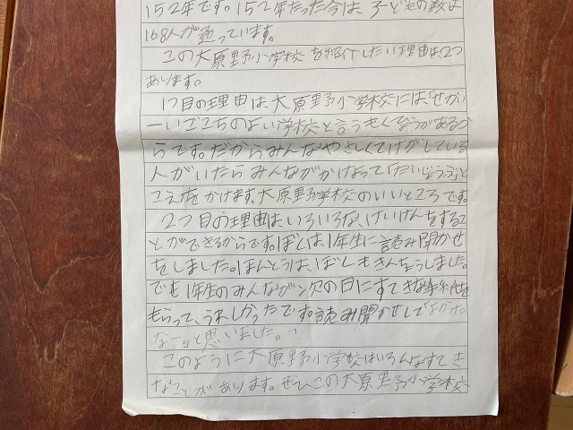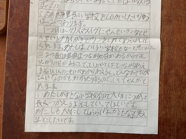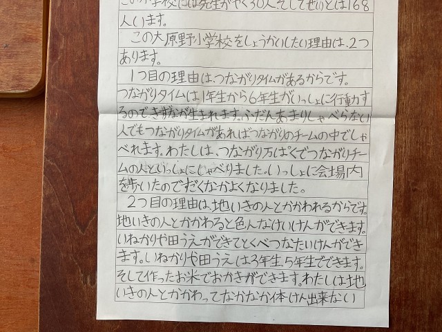 インタビューや自分たちが体験したことをもとに書いた大原野小学校のいいところです。