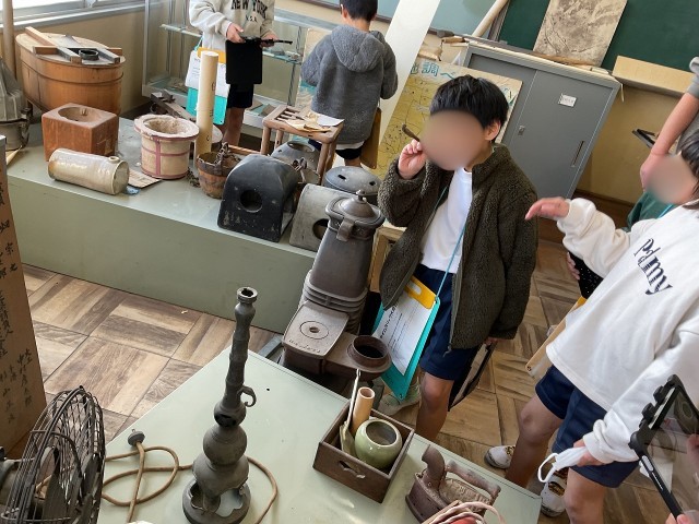 総合の学習では、大原野小学校地域で使われていた昔の道具を「郷土資料室」に行きました。