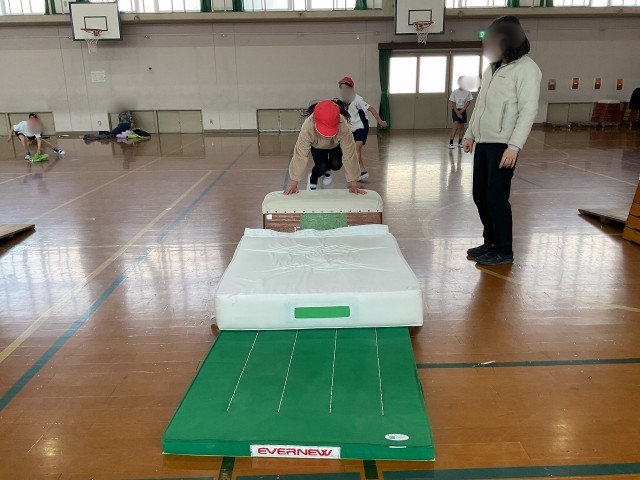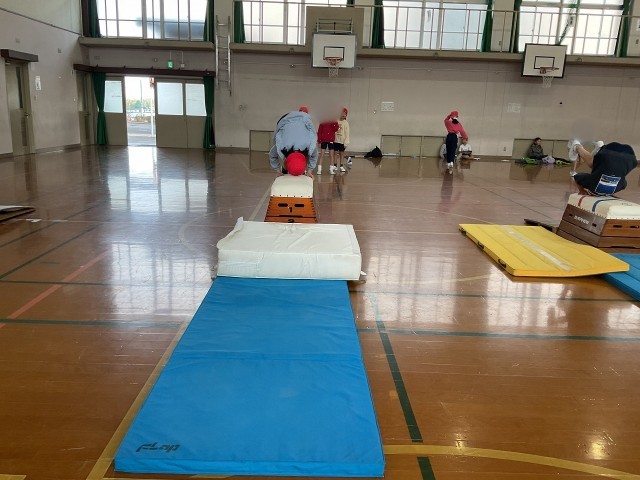 台上前転やかかえこみとびにチャレンジするために、まずは低めの4段で練習しています。