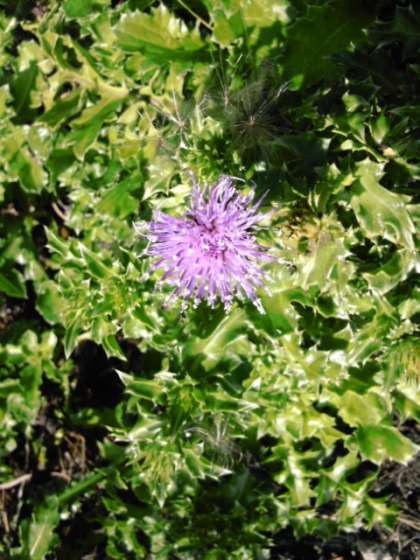 宮崎浜でハマアザミを見つけました。京都で見られるアザミと違い、葉は肉厚でツヤツヤとしています。これは直射日光の強い海岸近くで生き延びるために、日光を反射する等して身を守っているのです。