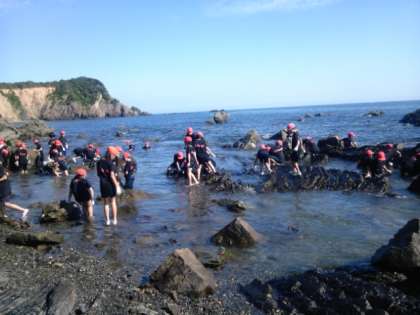 子どもたちが楽しみにしていた磯観察です。カニやナマコ、ウメボシイソギンチャクなどを見つけて歓声をあげていました。