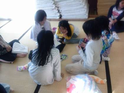子どもたちが予定よりも早く行動できているので30分間、自由時間となりました。部屋でトランプをする人、外で自然に親しむ人。思い思いに過ごしています。