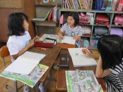 来週から,社会科の時間に校区たんけんへ出かけます。今日は,学校の周りや家の近くに紹介したい場所がないかを考えて交流しました。