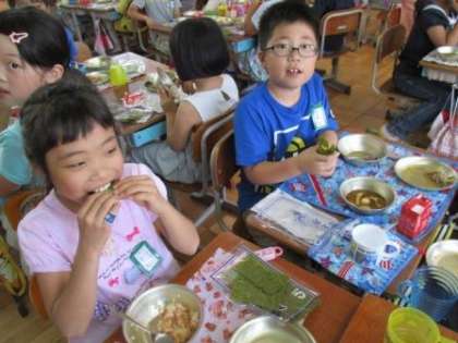 今日の給食は,セルフおにぎりでした。のりが大きくて子どもたちに人気です。