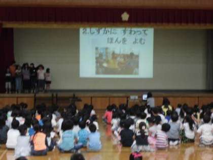 今回の児童集会は,全校合唱のあと,図書委員会と人権委員会の発表でした。
