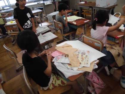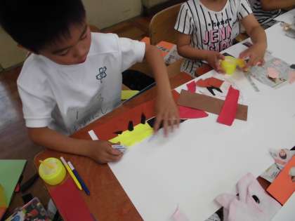 そして,好きに破った紙を組み合わせて,思い思いの作品を作っていました。恐竜を作る人もいれば,ぞうを作る人もいました。どんな作品が出来上がるのか,とても楽しみです。