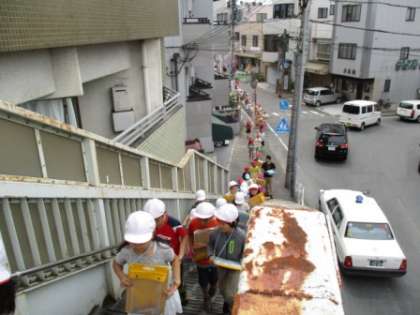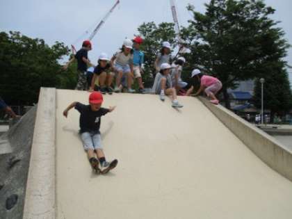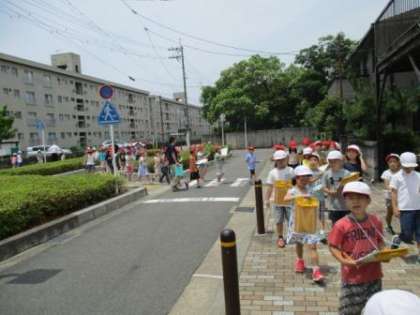 いよいよ,まちたんけんの最終日。みんなは,慣れてきて,どんどん見つけたことを地図に書きこんでいました。今日のコースには,大きな公園があったので3分間だけ遊びました。