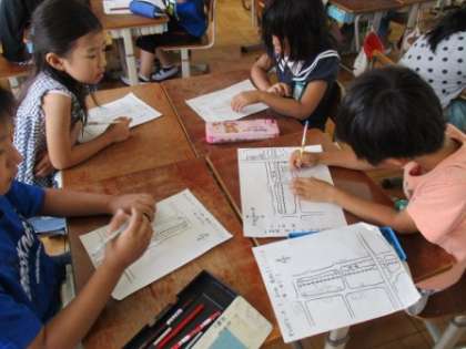校区たんけんが終わりました。3つのコースをまわったので,班のみんなで1枚の地図にまとめています。