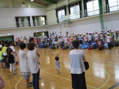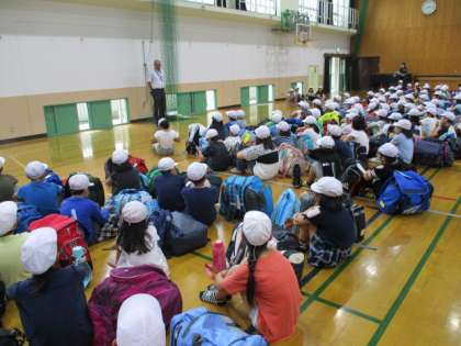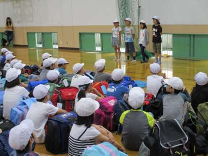 朝方まで降っていた雨が深草小学校の4年生のために止んでくれました。体育館での出発式では,宿泊学習の3つの約束を確認し,お家の方へも「いってらしゃい」を伝えました。ここからもう宿泊学習の始まります。