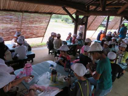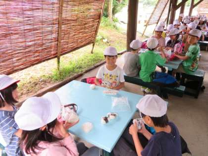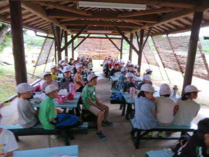 入所式を終え,昼食の時間です。芝生広場にある東屋に移動して,お弁当のおにぎりを,みんな美味しそうに食べています。