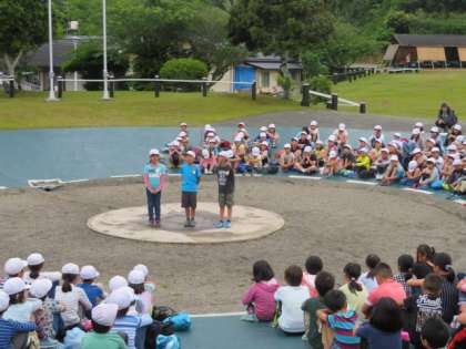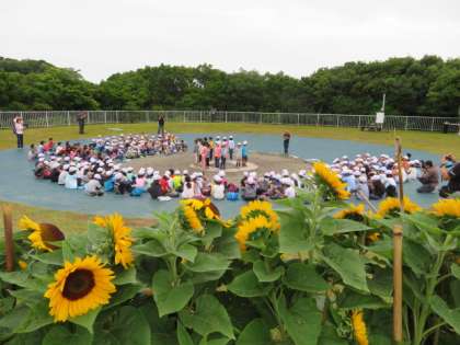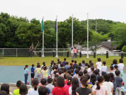 全員元気に朝の集いに集合できました。深草小といっしょに3日間みさきの家で過ごす,翔鸞小学校と柏野小学校と3校合同で,学校紹介を行いました。