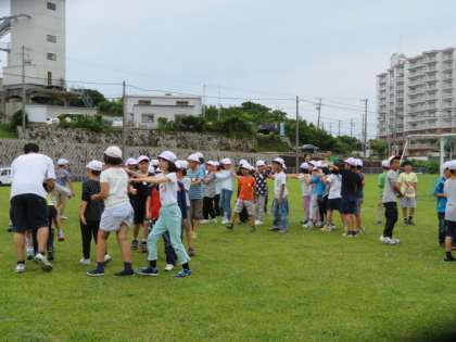 T島先生考案の・・・とっても楽しそうですね。4年生のみんなも笑顔です。でも,きっとT島先生が一番楽しんで笑顔なのではないでしょうか?4年生のみんな,T島先生に負けないように元気いっぱい,思いっきり楽しんでね!