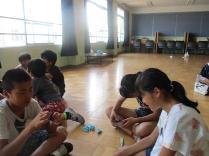 修学旅行に、千羽鶴を持っていきます。全校でおってもらった折り鶴を、1羽1羽丁寧につなぎました。