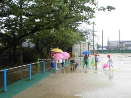 雨の日に傘を持って,運動場や中庭などを探検しました。運動場には,たくさんの水たまりができていて,水たまりの中に入りながら,歩きました。砂場にはたくさんの水がたまっていて,子どもたちはとても驚いていました。「水がとてもふかかったよ」「つめたくてきもちよかったよ」などと,嬉しそうに話している姿が見られました。