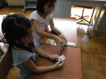 大切に育はながててきた朝がおの花がらを使って,色水を作りました。色水に好きな形に折った半紙を浸して,模様を付けました。ちょうちょのような形ができた人や船のような形になった人など様々でした。