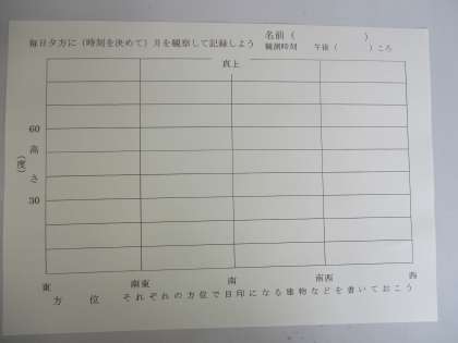 夏休み明けからは、太陽と月の関係について学習しています。時刻と場所を決めて、月の観察の宿題があります。月の形がどう変わっていくか、月が見える場所はどうかなどしっかり観察してほしいと思います。夜遅い時間の場合はお家の方と一緒に見てもらえたらと思います。よろしくお願いします。
